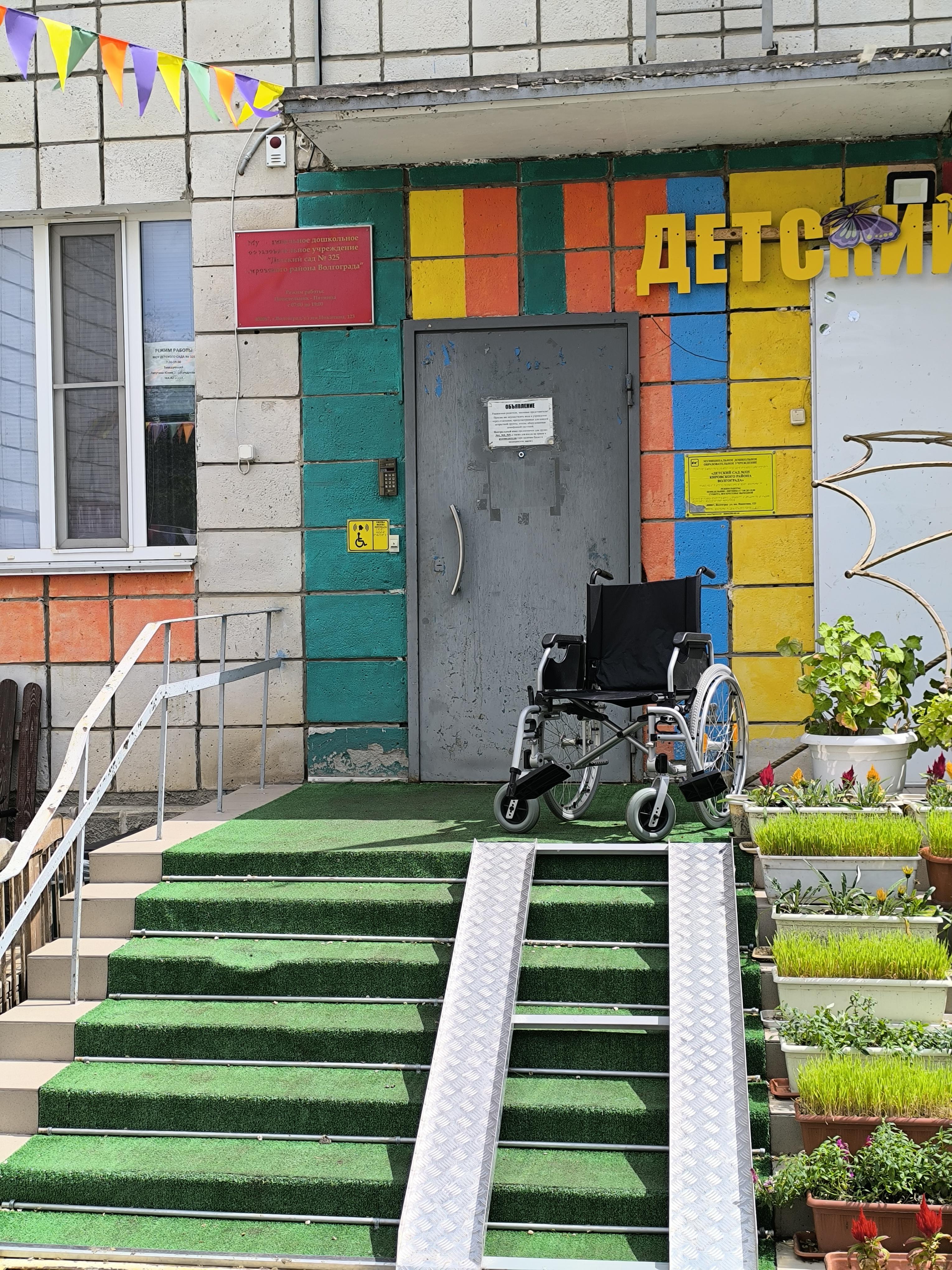 наличие выделенных стоянок для автотранспортных средств инвалидов - нет, в следствии отсутствия доступной прилегающей территории по всему периметру, ближайшая стоянка расположена по адресу: ул. Кирова, 141, Волгоград, Волгоградская обл., 400079. (МОУ "Детский сад №325" подал заявку об оказании содействия в установке дорожного знака 6.4 "Парковка" (парковочное место) с табличкой 8.17 "Инвалид" Письмо дорожный знак инвалид.